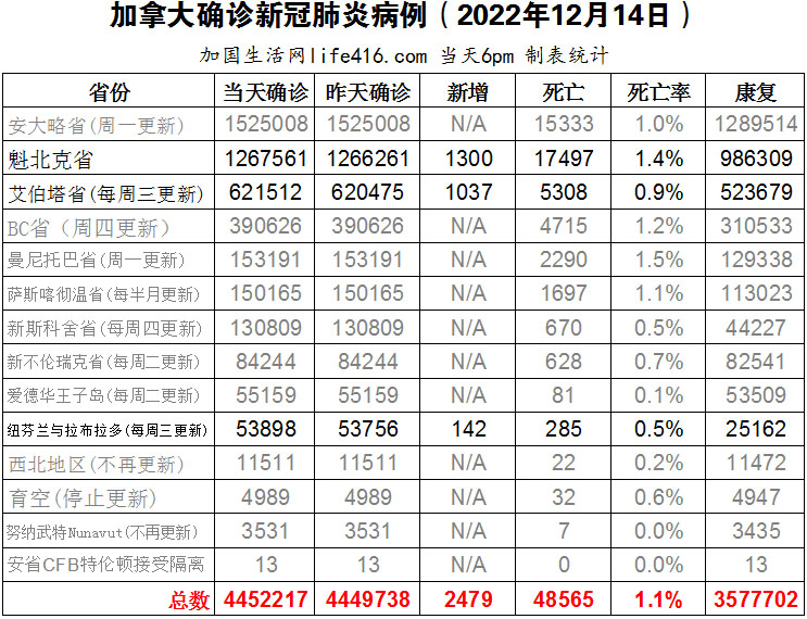 【加国生活网编译报道】截至2022年12月14日下午6点,加拿大新冠确诊病例总数为4452217(新增2479),死亡48565(新增64),魁省确诊总数1267561(新增1300,死亡新增12);艾省确诊总数621512(一周新增1037,死亡新增46);纽芬兰与拉布拉多确诊总数53898(一周新增142,死亡新增6)。美国疫情一直是加拿大疫情的风向标!在美国,与新冠病毒相关的住院人数再次攀升,老年人在美国死亡人数中所占比例越来越大,只有不到一半的疗养院居民接种了新冠疫苗,这些令人担忧的迹象预示着老年人将度过一个艰难的冬天。加国生活网专门制作了如下统计数据表: