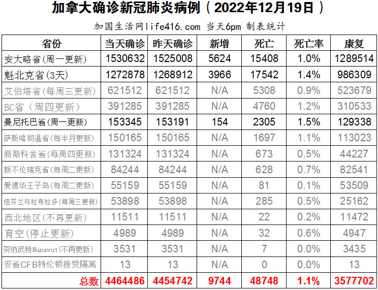 【加国生活网编译报道】截至2022年12月19日下午6点,加拿大新冠确诊病例总数为4464486(新增9744),死亡48748(新增118),安省确诊总数1530632(一周新增5624,死亡新增75);魁省确诊总数1272878(3天新增3966,死亡新增28);曼省确诊总数153345(一周新增154,死亡新增15)。加拿大首席卫生官Theresa Tam博士说:“马上要进入圣诞和新年假期,人们会希望更多地聚在一起,这是自新冠疫情以来第一个没有限制具体行动或限制接触的假期,考虑到这一点,我们在与家人和朋友聚会时要更多地保护自己”。加国生活网专门制作了如下统计数据表: