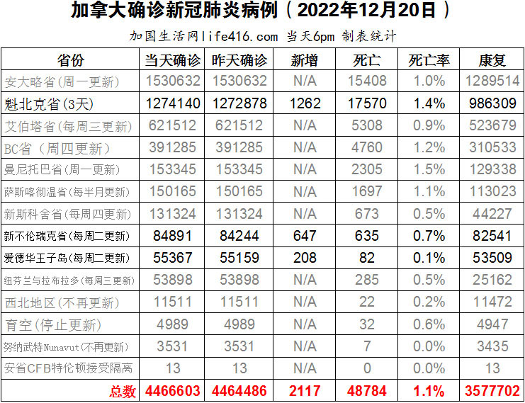 【加国生活网编译报道】截至2022年12月20日下午6点,加拿大新冠确诊病例总数为4466603(新增2117),死亡48784(新增36),魁省确诊总数12741408(新增1262,死亡新增28);新不伦瑞克省确诊总数84891(一周新增647,死亡新增7);爱德华王子岛确诊总数55367(一周新增208,死亡新增1)。随着加拿大开始进入后疫情时代,连国会议员也在一直考虑未来下议院使用混合办公模式;根据环境部长提议的新规定,到2026年强制要求加拿大电动车销量要达到20%、到2030 年要达到60%、到2035年销售的每辆乘用车都需要是电动的。加国生活网专门制作了如下统计数据表: