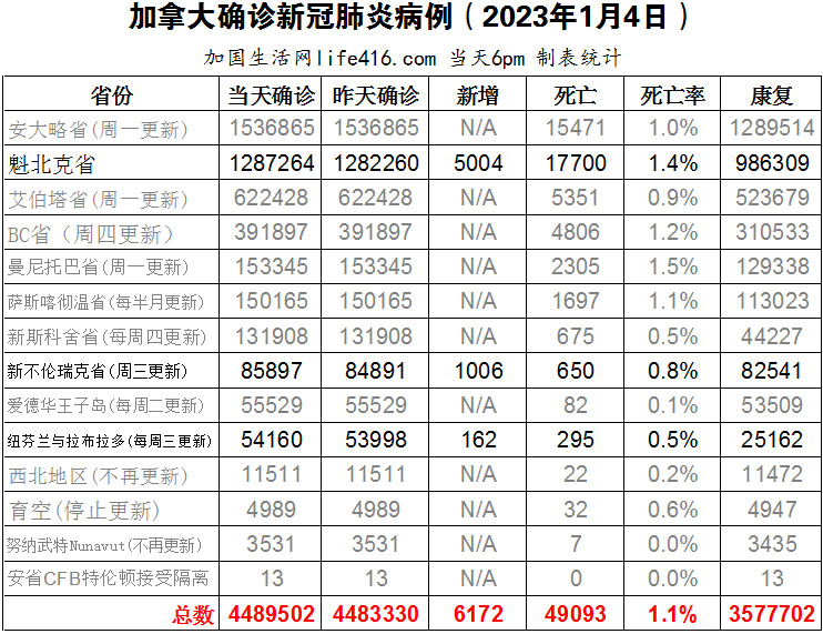 【加国生活网编译报道】截至2023年1月4日下午6点,加拿大新冠确诊病例总数为4489502(新增6172),死亡49093(新增49),魁省确诊总数1287264(新增5004,死亡新增30);新不伦瑞克省确诊总数85897(新增1006,死亡新增15);纽芬兰与拉布拉多确诊总数54160(新增162,死亡新增4)。随着拥有迄今为止最强抗体逃避能力的Omicron 亚变体 XBB.1.5持续在美国高速传播并引发各届担忧,加拿大公共卫生部PHAC表示,截至1月4日已确诊21例XBB.1.5病例,不过现在判断该变体是否正在加拿大地区传播还“为时过早”。加国生活网专门制作了如下统计数据表:
