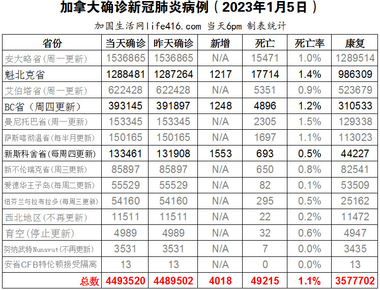 【加国生活网编译报道】截至2023年1月5日下午6点,加拿大新冠确诊病例总数为4493520(新增4018),死亡49215(新增122),魁省确诊总数1288481(新增1217,死亡新增14);BC省确诊总数393145(新增1248,死亡新增90);新斯科舍省确诊总数133461(新增1553,死亡新增18)。加拿大科学家们正在采集国际机场来自飞机厕所的废水样本,以确定国际乘客和机组人员可能将哪些新冠变体和亚变体带入加拿大,从而获取潜在的新变体预警。加国生活网专门制作了如下统计数据表: