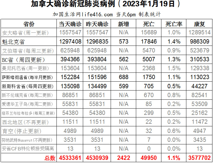 【加国生活网编译报道】截至2023年1月19日下午6点,加拿大新冠确诊病例总数为4533361(新增2422),死亡49950(新增82),魁省确诊总数1297408(新增573,死亡新增15);BC省确诊总数394366(一周新增562,死亡新增46);萨省确诊总数152284(一周新增688,死亡新增16);新斯科舍省确诊总数135098(一周新增599,死亡新增5)。加拿大制造可吸入式新型新冠疫苗正在安省汉密尔顿的麦克马斯特大学开发,并将进入第二阶段人体试验。加国生活网专门制作了如下统计数据表: