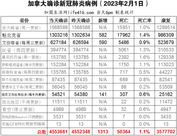 【加国生活网编译报道】截至2023年2月1日下午6点,加拿大新冠确诊病例总数为4553661(新增1313),死亡50364(新增37),魁省确诊总数1303216(新增582,死亡新增8);艾省确诊总数627184(一周新增590,死亡新增21);纽芬兰与拉布拉多确诊总数54521(一周新增141,死亡新增8)。红十字会与红新月会国际联合会(IFRC)在1月30日发布的一份报告中表示,全球所有国家都对未来的流行病“准备不足”,并呼吁各国在年底前更新其准备计划。加国生活网专门制作了如下统计数据表: