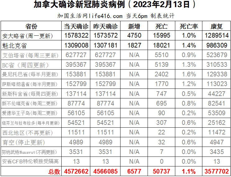 【加国生活网编译报道】截至2023年2月13日下午6点,加拿大新冠确诊病例总数为4572662(新增6577),死亡50737(新增98),安省确诊总数1578322(一周新增4750,死亡新增79);魁省确诊总数1309009(3天新增1827,死亡新增19)。安省一项最新研究发现,新冠口服药Paxlovid 被证明可以降低可能患有重病的人因新冠而住院和死亡的风险,该项研究已经发表在加拿大医学会杂志上。加国生活网专门制作了如下统计数据表: