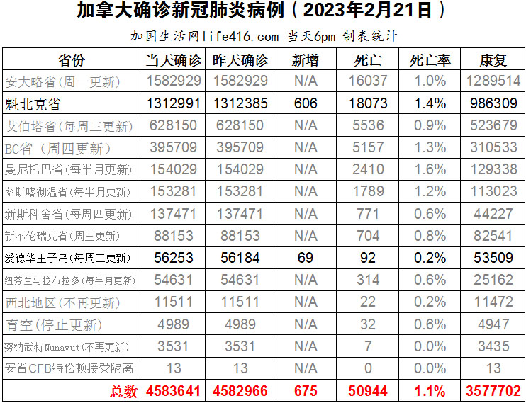 【加国生活网编译报道】截至2023年2月21日下午6点,加拿大新冠确诊病例总数为4583641(新增675),死亡50944(新增10),魁省确诊总数1312991(新增606,死亡新增10);爱德华王子岛确诊总数56253(一周新增69)。虽然新冠疫情最严重时期似乎已经过去,但医院现在正在处理新冠病毒感染的后遗症,因为越来越多的研究表明病毒与心脏相关问题之间存在联系,尤其是在年轻人中。心脏病专家认为新冠病毒确实会通过多种机制影响心脏,那中医理论如何解释?加国生活网专门制作了如下统计数据表: