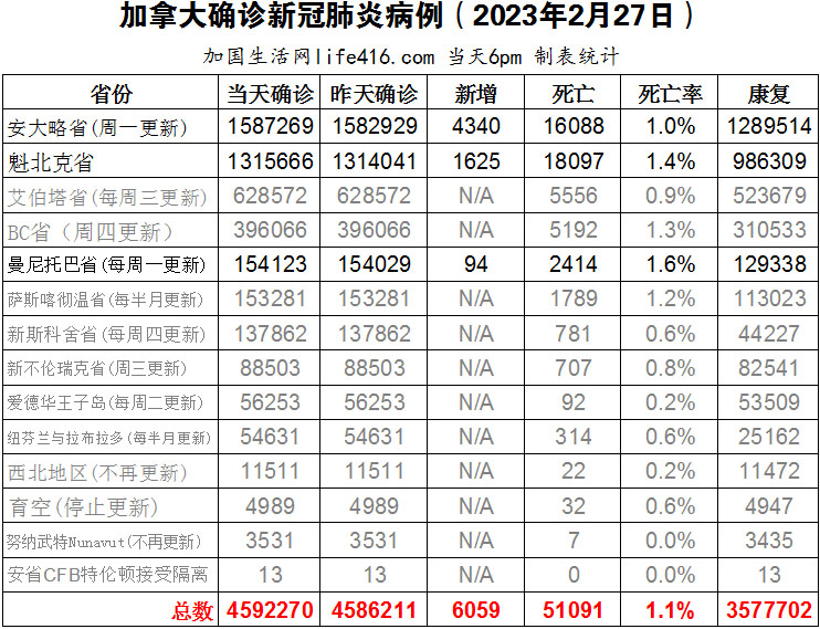 【加国生活网编译报道】截至2023年2月27日下午6点,加拿大新冠确诊病例总数为4592270(新增6059),死亡51091(新增68),安省确诊总数1587269(一周新增4340,死亡新增51);魁省确诊总数1315666(3天新增1625,死亡新增13);曼省确诊总数154123(一周新增94,死亡新增4)。美国食品和药物管理局FDA于2023年2月24日批准了首个可在家中使用的用于联合检测新冠病毒和流感病毒的测试盒,让消费者能够轻松确定流鼻涕是否由这两种病毒所引起。加国生活网专门制作了如下统计数据表: