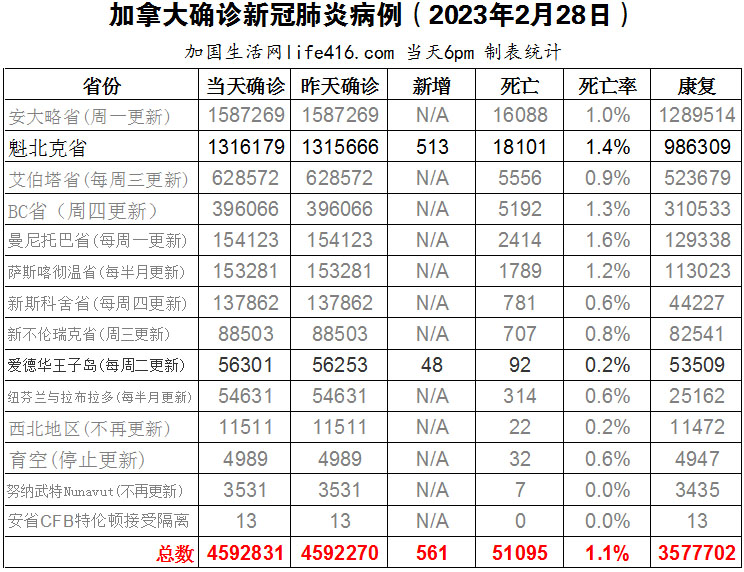 【加国生活网编译报道】截至2023年2月28日下午6点,加拿大新冠确诊病例总数为4592831(新增561),死亡51095(新增4),魁省确诊总数1316179(新增513,死亡新增4);爱德华王子岛省确诊总数56301(一周新增48)。有史以来第一次,一种用人工智能设计的新冠药物即将进入临床试验,总部位于香港的加拿大AI制药公司Insilico Medicine宣布,临床研究发现该药物能“显著降低”病毒载量和肺部炎症。加国生活网专门制作了如下统计数据表: