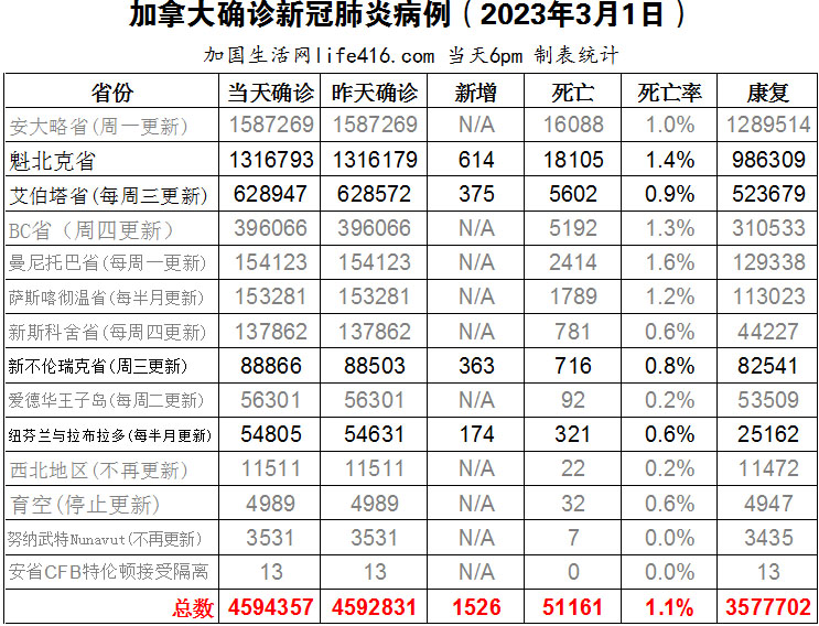 【加国生活网编译报道】截至2023年3月1日下午6点,加拿大新冠确诊病例总数为4594357(新增1526),死亡51161(新增66),魁省确诊总数1316793(新增614,死亡新增4);艾省确诊总数628947(一周新增375,死亡新增46);新不伦瑞克省确诊总数88866(一周新增363,死亡新增9);纽芬兰与拉布拉多省确诊总数54805(一周新增174,死亡新增7)。美国疾病控制与预防中心的一个专家咨询小组上周五表示,没有足够的证据建议老年人和免疫系统较弱的人每年接种一剂以上的新冠加强剂疫苗。加国生活网专门制作了如下统计数据表: