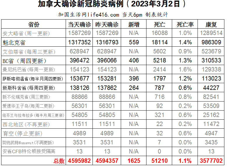 【加国生活网编译报道】截至2023年3月2日下午6点,加拿大新冠确诊病例总数为4595982(新增1625),死亡51210(新增49),魁省确诊总数1317352(新增559,死亡新增9);BC省确诊总数396472(一周新增406,死亡新增26);萨省确诊总数153677(一周新增396,死亡新增8);新斯科舍省确诊总数138126(一周新增264,死亡新增6)。一项最新的研究比较了 166 个国家在新冠大流行的前 22 周内关闭边界的数据,结果表明大多数有针对性的关闭,例如针对来自新冠热点地区的旅行者,对遏制新冠病毒的传播几乎没有作用。加国生活网专门制作了如下统计数据表: