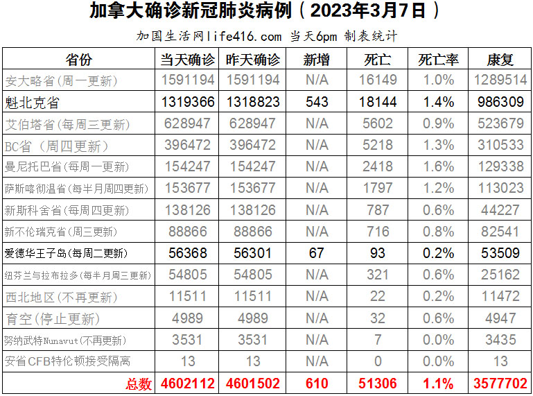 【加国生活网编译报道】截至2023年3月7日下午6点,加拿大新冠确诊病例总数为4602112(新增610),死亡51306(新增13),魁省确诊总数1319366(新增543,死亡新增12);爱德华王子岛确诊总数56368(一周新增67,死亡新增1)。在加拿大的一项最新研究中,研究人员发现,曾感染过新冠病毒的参与者不仅在两项特定的认知任务上表现更差,而且大脑成像显示,在执行这些任务期间,通常会完全参与工作的大脑区域出现缺氧的情况。加国生活网专门制作了如下统计数据表: