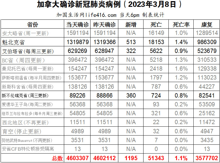 【加国生活网编译报道】截至2023年3月8日下午6点,加拿大新冠确诊病例总数为4603307(新增1195),死亡51343(新增37),魁省确诊总数1319879(新增513,死亡新增9);艾省确诊总数629269(一周新增322,死亡新增20);新不伦瑞克省确诊总数89226(一周新增360,死亡新增8)。安省首席卫生官发布了自新冠疫情爆发以来的第一份年度报告,他在报告中强调不要让公共卫生成为繁荣和萧条周期的牺牲品,就算新冠从省民的记忆中消失,安省也不能让公共卫生的准备工作再次落空,因为下一次疫情的到来不是会不会发生的问题,而是何时发生的问题。加国生活网专门制作了如下统计数据表: