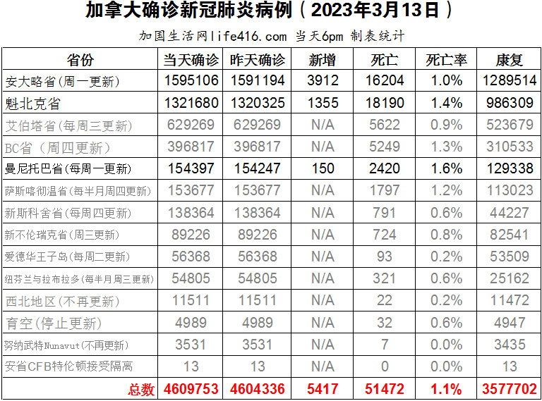 【加国生活网编译报道】截至2023年3月13日下午6点,加拿大新冠确诊病例总数为4609753(新增5417),死亡51472(新增87),安省确诊总数1595106(一周新增3912,死亡新增55);魁省确诊总数1321680(3天新增1355,死亡新增30);曼省确诊总数154397(一周新增150,死亡新增2)。2023年3月11日星期六是世界卫生组织宣布新冠疫情正式开始的三周年,加拿大首席卫生官在当天表示,新冠疫情在加拿大已达到相对稳定的状态。加国生活网专门制作了如下统计数据表: