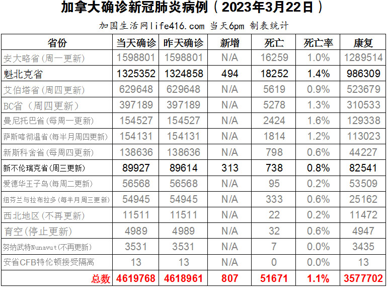 【加国生活网编译报道】截至2023年3月22日下午6点,加拿大新冠确诊病例总数为4619768(新增807),死亡51671(新增16),魁省确诊总数1325352(新增494,死亡新增8);新不伦瑞克省确诊总数89927(一周新增313,死亡新增8)。目前爆发的这波禽流感病毒名为 H5N1,已经杀死了创纪录数量的鸟类和受感染的哺乳动物。好在,人类被感染的病例仍然非常罕见。全球卫生官员表示,人与人之间传播的风险仍然很低。一些世界领先的流感疫苗制造商表示,如果一种新的禽流感病毒跨越物种鸿沟,他们可以在几个月内为人类生产数亿支禽流感疫苗。加国生活网专门制作了如下统计数据表: