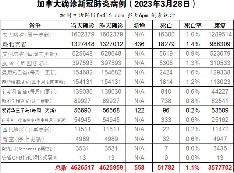 【加国生活网编译报道】截至2023年3月28日下午6点,加拿大新冠确诊病例总数为4626517(新增558),死亡51782(新增11),魁省确诊总数1327448(新增436,死亡新增10);爱德华王子岛确诊总数56690(一周新增122)。加拿大统计局在3月28日与加拿大公共卫生部和新冠免疫特别工作组合作发布的结果表明,在 2022 年的大约一半时间里,几乎所有加拿大成年人都具有针对新冠病毒的抗体,其中大多数是通过先前的感染获得的。加国生活网专门制作了如下统计数据表: