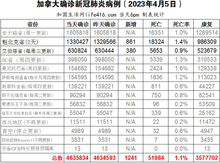 【加国生活网编译报道】截至2023年4月5日下午6点,加拿大新冠确诊病例总数为4635834(新增1241),死亡51984(新增26),魁省确诊总数1330427(2天新增861,死亡新增16);艾省确诊总数630824(一周新增380,死亡新增10)。据加拿大食品检验局(CFIA)称,安省奥沙瓦的一只狗感在咀嚼一只野生大雁后感染了被称为H5N1的禽流感,在出现了“临床症状”后死亡。该病例于4月1日得到确认,尸检于4月3日完成,尸检显示死亡涉及呼吸系统。加国生活网专门制作了如下统计数据表: