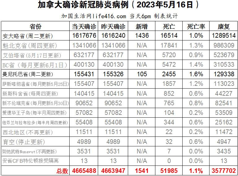 由于加拿大各省的疫情数据更新纷纷转成每周、每半个月或每月更新,加国生活网的疫情报道也将从5月1日起转为每周二次报道,即每周二和每周四报道,请理解!
