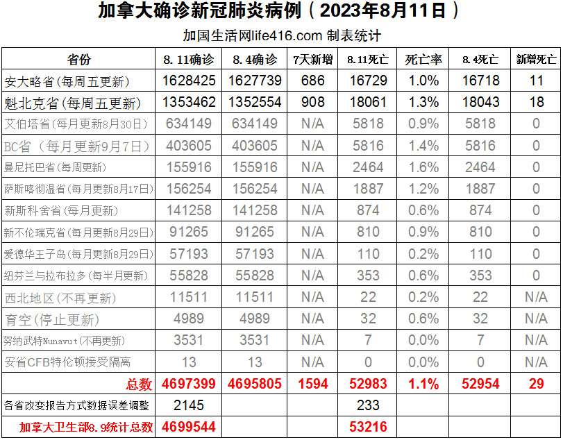 【加国生活网编译报道】截至2023年8月11日,加拿大新冠确诊病例总数为4697399(一周新增1594),死亡52983(一周新增29例)。由于加拿大各省在最近几个月纷纷调整疫情数据的报告方式,由每天改为每周、每半月和每月,导致各省的数据统计存在一些疏漏,加国生活网只能根据加拿大卫生部的数据查漏补缺,加拿大卫生部官网截至8月9日的数据显示新冠确诊病例总数为4699544、死亡53216。安省确诊总数1628425(一周新增686,死亡新增11);魁省确诊总数1353462(一周新增908,死亡新增18)。Omicron又双叒叕出新亚变体!!一种名为 EG.5 的快速增长的 Omicron 亚变体目前正在加拿大、美国、中国、日本、韩国等许多国家流行,世界卫生组织将该最新变体归类为“感兴趣的变体”,并表示该毒株似乎并不比其他变体对公共健康构成更大的威胁。加国生活网专门制作了如下统计数据表:
