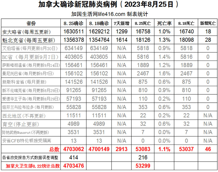 【加国生活网编译报道】截至2023年8月25日,加拿大新冠确诊病例总数为4703062(一周新增2913),死亡53083(一周新增46例)。由于加拿大各省在最近几个月纷纷调整疫情数据的报告方式,由每天改为每周、每半月和每月,导致各省的数据统计存在一些疏漏,加国生活网只能根据加拿大卫生部的数据查漏补缺,加拿大卫生部官网截至8月22日的数据显示新冠确诊病例总数为4703476、死亡53299。安省确诊总数1630511(一周新增1299,死亡新增18);魁省确诊总数1356378(一周新增1614,死亡新增28)。加拿大卫生部官员证实,卫生部正在监测在多个国家发现的一种全新高度突变变体BA.2.86,世卫组织也已将该新变体添加到正在监测的新冠变体列表中。与此同时,经过几个月的病例下降后,安省公共卫生数据显示今年夏天的新冠确诊病例有所增加。加国生活网专门制作了如下统计数据表: