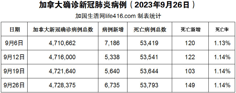 【加国生活网编译报道】截至2023年9月26日,加拿大新冠确诊病例总数为4,728,375(一周新增6,735),死亡53,793(一周新增149例)。加拿大卫生部已批准辉瑞针对奥密克戎XBB.1.5亚变体的新冠疫苗;随着BC省的医护人员收到通知,他们将再次被要求在医疗环境中戴口罩,一名急诊室医生敦促安省医护人员效仿,并警告称,全省各地的感染率正在上升。安省医生Steve Findall博士说:“我们肯定看到了激增,我们的检测阳性率急剧上升。” 加国生活网专门制作了如下统计数据表: