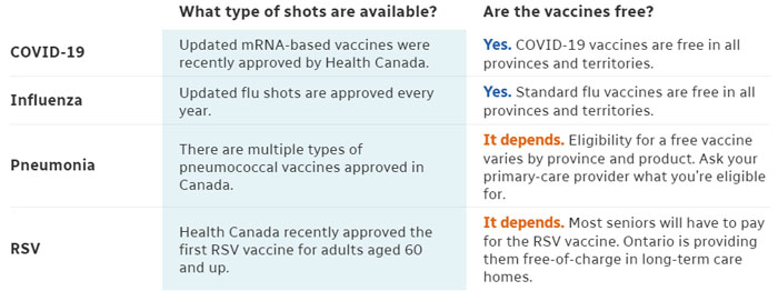 加拿大各地免费提供新冠疫苗和标准流感疫苗,一些省份还为老年人提供免费的强化流感疫苗,这比标准剂量提供更好的保护,但哪种增强型流感疫苗对老年人免费还取决于您所居住的省份。例如,在BC省,一种带有佐剂的流感疫苗可以产生更强的免疫反应,对所有 65 岁及以上的成年人免费,而另一种也建议老年人接种的高剂量流感疫苗却仅对长期护理人员、辅助生活设施和原住民社区免费。