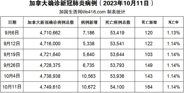 【加国生活网编译报道】截至2023年10月11日,加拿大新冠确诊病例总数为4,749,610(一周新增10,672),死亡54,100(一周新增164例)。随着加拿大新冠新增确诊病例连续两周超过1万例,又由于预计呼吸道病毒季节即将到来,加拿大各地医院纷纷重启口罩规定,例如包括哈利法克斯的 IWK 儿童医院在内的所有新斯科舍省的卫生机构正在恢复佩戴口罩的要求,以应对新冠病毒和呼吸道病毒所带来的风险。加国生活网专门制作了如下统计数据表: