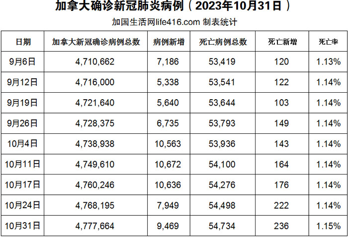 【加国生活网编译报道】截至2023年10月31日,加拿大新冠确诊病例总数为4,777,664(一周新增9,469),死亡54,734(一周新增236例)。当加拿大首次推出针对新冠的疫苗时,广播和电视广播中充斥着面向公众的疫苗信息,并在网上和社交媒体上反复出现。超过 80% 的加拿大人做出了反应,在大规模疫苗接种诊所排队或预约接种初始的两剂疫苗。在接下来的几年里,联邦、省和地区的三级政府继续开展公众宣传活动,积极推广加强剂疫苗以防止免疫力下降,但接种率却相当低。加国生活网专门制作了如下统计数据表: