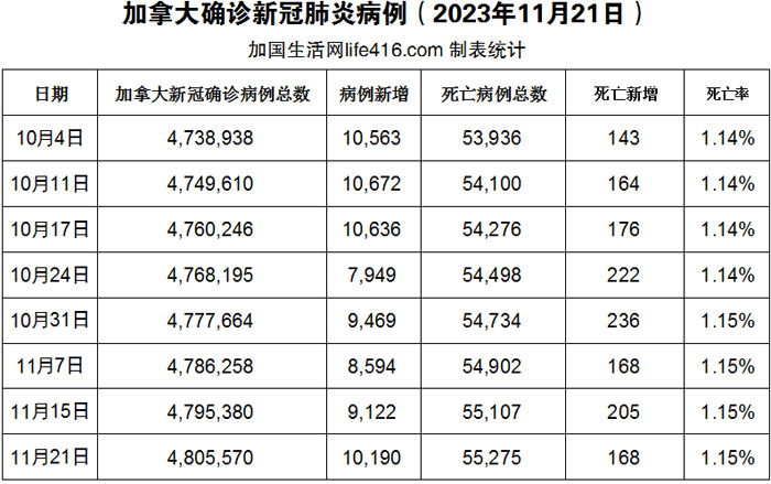【加国生活网编译报道】截至2023年11月21日,加拿大新冠确诊病例总数为4,805,570(一周新增10,190),死亡55,275(一周新增168例)。随着咳嗽和感冒季节的到来,医学专家提醒:抗生素并不是治疗常见病毒性呼吸道感染的首选方法。过度处方(包括根据患者的要求)和滥用抗生素正在加剧抗生素耐药性,这是一种全球性的健康威胁,并产生一线抗生素无法治疗的超级细菌。加国生活网专门制作了如下统计数据表: