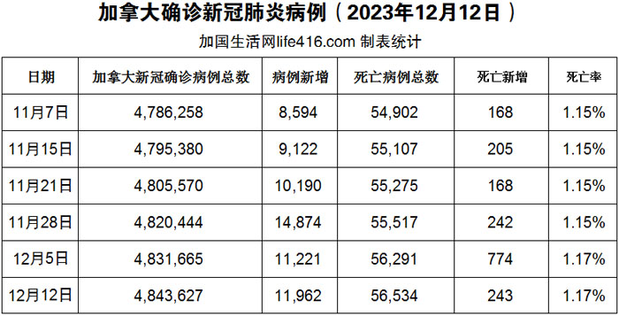 【加国生活网编译报道】截至2023年12月12日,加拿大新冠确诊病例总数为4,843,627(一周新增11,962),死亡56,534(一周新增243例)。根据加拿大公共卫生部PHAC的最新数据显示,进入流感季节的第二周,流感病例呈上升趋势,其中猪流感(swine flu)是发现最多的亚型流感病毒;根据加拿大统计局在12月8日发布的一份报告显示,九分之一的加拿大成年人因感染新冠病毒而出现长期症状,这相当于 350 万加拿大人。报告称,近 80% 有长期症状的人症状持续六个月或更长时间,其中 42% 的人症状持续一年或更长时间。加国生活网专门制作了如下统计数据表: