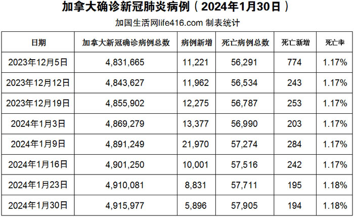 【加国生活网编译报道】截至2024年1月30日,加拿大新冠确诊病例总数为4,915,977(一周新增5,896),死亡57,905(一周新增194例,死亡率确实上升了)。由于新冠疫情期间儿童常规疫苗接种量下降,目前加拿大全国各地的公共卫生官员正在努力让加拿大学生了解那些虽严重但可预防疾病的最新免疫接种信息。仅在安省西南部的滑铁卢地区,公共卫生官员就表示,他们已经向 32,000 名中小学生的家庭发出了信函,通知他们因未完成象麻疹、水痘和百日咳等可预防疾病的疫苗接种而面临停学的风险。加国生活网专门制作了如下统计数据表: