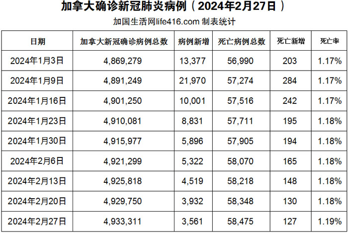 【加国生活网编译报道】截至2024年2月27日,加拿大新冠确诊病例总数为4,933,311(一周新增3,561),死亡58,475(一周新增127例,死亡率又上升了)。在全球一些国家麻疹病例上升以及加拿大出现少数麻疹确诊病例的情况下,加拿大公共卫生部首席公共卫生官Theresa Tam敦促加拿大人及时接种麻疹疫苗。她说:“随着春假旅行季节的到来,加拿大公共卫生部担心,全球麻疹活动激增,加上加拿大学龄儿童麻疹疫苗覆盖率下降,可能会导致更多输入病例,可能导致麻疹在加拿大社区传播。我强烈建议加拿大所有人接种两剂麻疹疫苗,特别是在旅行前。如果需要,麻疹疫苗最好在出发前至少两周进行接种,但即使在旅行前不到两周接种,仍然有益处。”加国生活网专门制作了如下统计数据表: