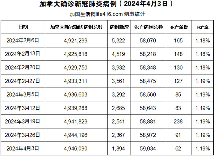 【加国生活网编译报道】因复活节长周末,加拿大公共卫生部的新冠数据延迟公布一天。截至2024年4月3日,加拿大新冠确诊病例总数为4,946,090(一周新增1,894),死亡59,034(一周新增62例)。早在今年1月份,加拿大国家免疫咨询委员会(NACI)就已经为另一轮春季疫苗接种做好了准备。NACI在一份声明中表示,从 2024 年春季开始,重症新冠病毒风险增加的个人可能会额外接种一剂基于 XBB.1.5 的最新疫苗,该疫苗可以更好地预防正在传播的病毒变种。这意味着以下人群建议接种最新疫苗:65 岁及以上的成年人、长期护理院和其他老年人聚集居住场所的成年居民、六个月或以上中度至严重免疫功能低下的任何人。加国生活网专门制作了如下统计数据表: