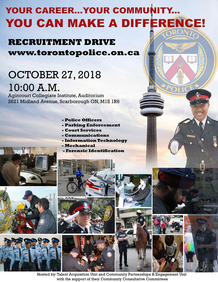 【加国生活网】多伦多警察局招聘部门(Talent Acquisition)和社区合作与参与部门(Community Partnerships & Engagement Unit)将在华人社区联合举办大型招聘会,以呼吁更多的有兴趣及志向的各界人士报考多伦多警队。届时招聘部门急社区联络部门的招聘官和联络官会现场讲解报考警队的要求与程序,并回答大家感兴趣的问题。