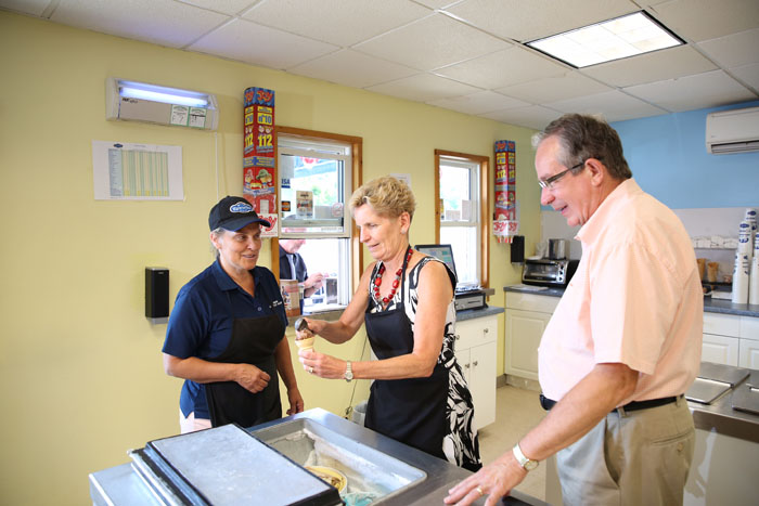 省长韦恩一试身手,从冰柜勺出雪糕,准备售予正在轮候的顾客。旁为安省小型商业厅厅长李尔。