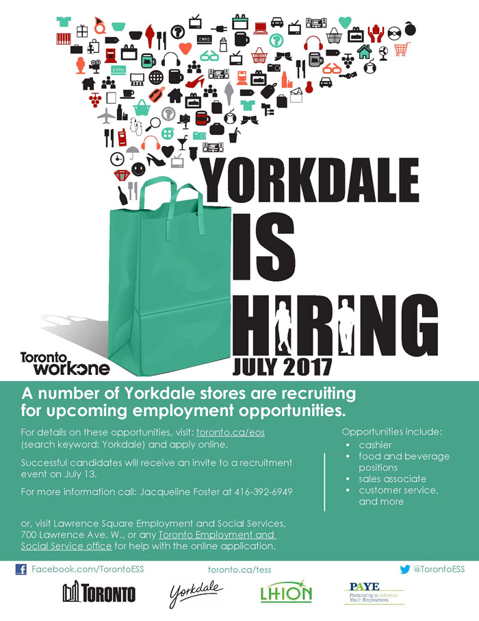 1、这些工作机会需要提前注册申请,请到www.toronto.ca/eos,在最下方的Keyword Search那里,输入yorkdale,就可以查询到所有yorkdale提供的工作,点击后就可以在线申请