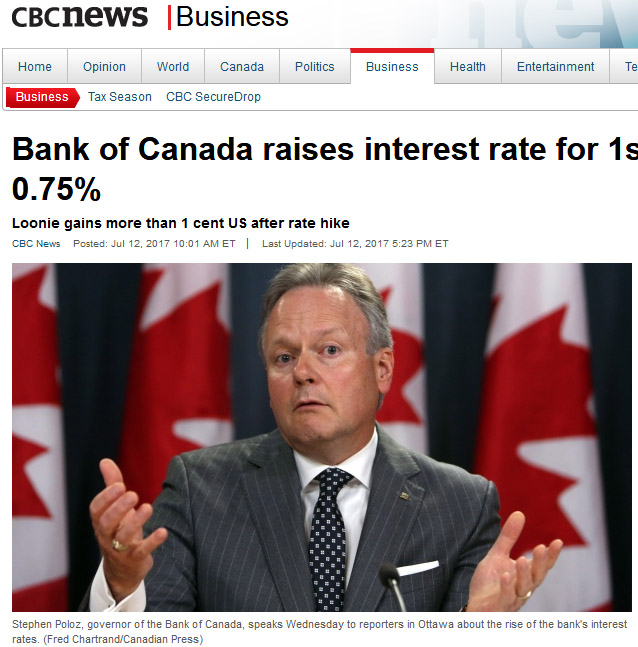 重磅消息:加拿大央行7月12日终于宣布加息0.25厘