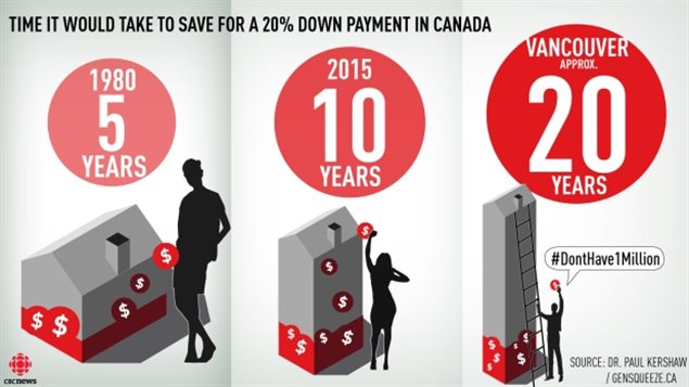 加拿大人存够20%购房首付过去和现在需要的年数 @CBC News