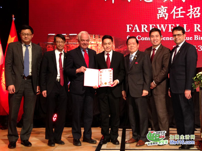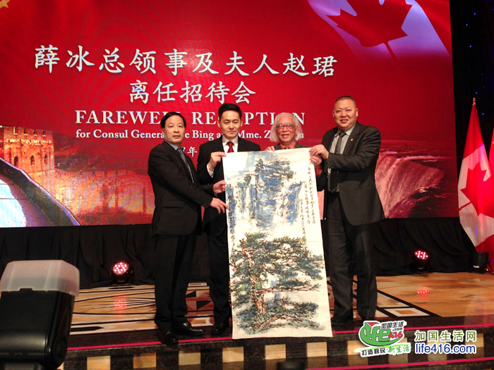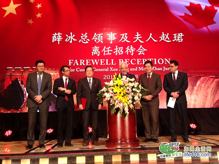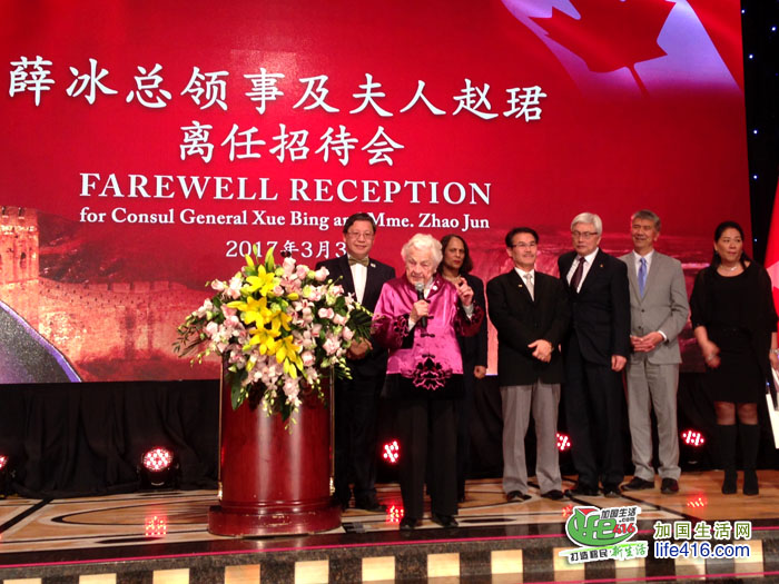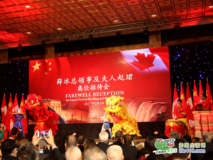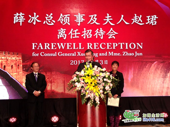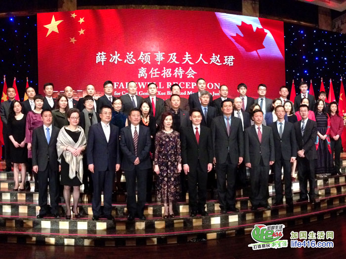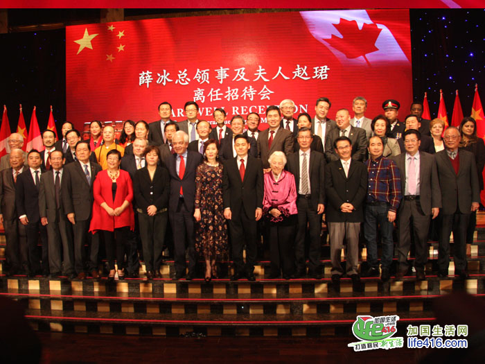 【加国生活网】中国驻多伦多总领事薛冰和夫人赵珺领事于2017年3月3日举行离任招待会。加拿大候任驻华大使麦卡勒姆(John McCallum)、联邦参议员胡子修、联邦众议员陈家诺、谭耕、马万里(Majid Jowhari)、扎西德(Salma Zahid)、陈圣源,安大略省国际贸易厅长陈国治、省议会副议长黄素梅、省议员董晗鹏、赵成俊,96岁高龄的密西沙加前市长麦考莲(Hazel McCallion)、万锦市市长斯卡皮蒂(Frank Scarpitti)、列治文山市市长巴罗(Dave Barrow)等加拿大三级政府代表,俄罗斯、法国、德国、印度尼西亚、格林纳达等多国驻多伦多总领事,以及多伦多华人团体联合总会主席林性勇等华侨华人、中资机构、留学生和各界代表近千人参加。