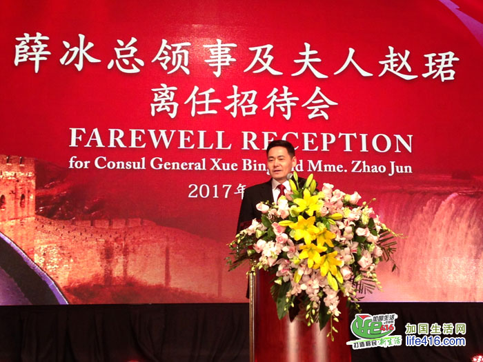 薛冰总领事首先致辞,回顾了担任驻多伦多总领事两年来中加关系,特别是中国与领区关系取得的积极进展。他表示,中方与领区在政治、经贸、科教、人文交往日益密切。经过双方的共同努力,驻多伦多总领馆所在领区已经成为中加友好交流合作的领头羊和发动机。两年来,总领馆始终秉持“以人为本、外交为民”的理念,着力打造海外民生工程,全力保护海外同胞的合法权益,为领区广大民众提供更加便利和舒心的服务。薛总对领区三级政府、广大华侨华人、中资机构和留学生及各界人士对促进中加友好以及对总领馆和他本人工作的支持和帮助表示感谢。