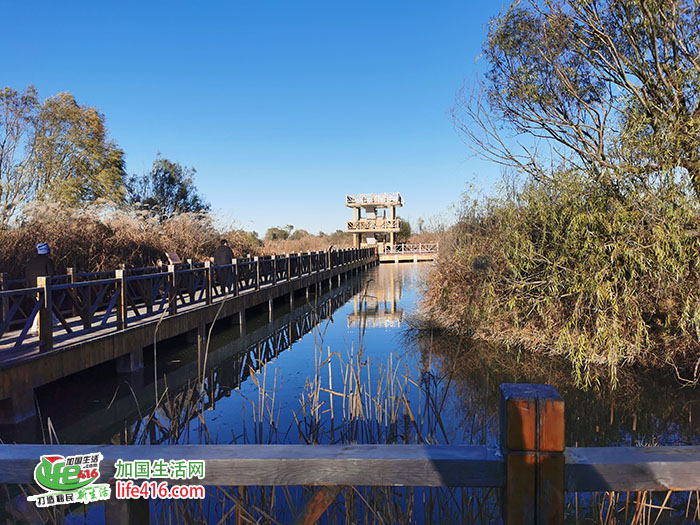 黄河故道天然柳林木栈道入口,长800米,木栈道上,可以一边观鸟赏鱼,一边品味曲径通幽的闲适,不时会看到鸿雁和斑头雁从身边游过。栈道周围傍水而生的高大植物群带就是天然柳林,种子从黄河上游冲刷下来,在这里落地生根、自然生长。