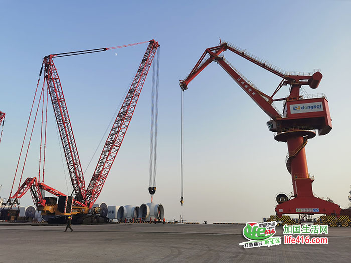 夕阳下的港口,巨型起重机正将百吨级的风电机舱、塔筒等构件吊装至专业运输船舶,场面震撼。