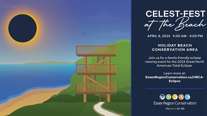 安省Windsor地区的假日海滩保护区(The Holiday Beach Conservation Area)将在Amherstburg举办一场适合家庭观看的活动,除了可以参加带导游的森林徒步活动外,现场还有天体主题工艺品以及小吃和饮料等零售摊位,入场费$15(门票包括一副日食眼镜)。