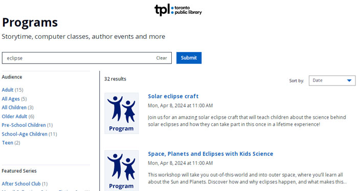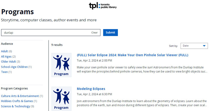 多伦多公共图书馆在4月8日当天将举办多项免费活动庆祝这一难得遇到的天体现象。许多分支机构将主办教育讲座,参与者将有机会制作和太阳有关工艺品比如有讲座将介绍日食的几何形状,制作针孔日食观察器并用望远镜安全地观察太阳表面。