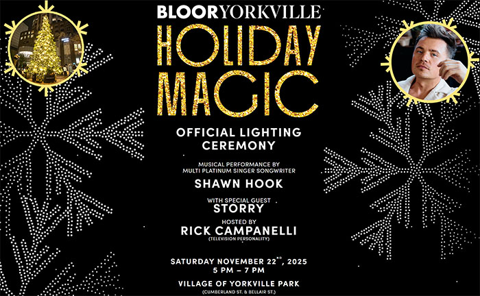 【加国生活网】每年圣诞前夕,Bloor-Yorkville 社区都将会举行为期一个月(从11月22日至12月31日)的Holiday Magic梦幻假日系列活动,而本周六11月22日是这个活动的开幕式,下午5点至7点期间,除了有官方的点灯仪式外,还有现场音乐会,Village of Yorkville Park和Bloor Street 也会到处灯光闪亮。现场还有免费热苹果汁饮料和点心提供。