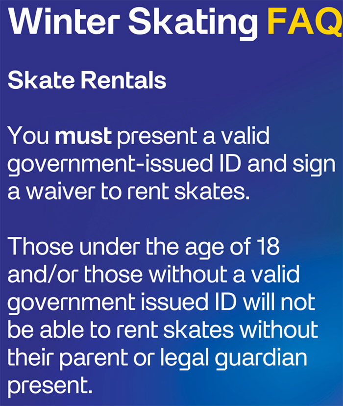 需要注意的是,2025-2026年度新增了规则,租赁滑冰鞋必须出示有效的政府颁发的身份证并签署免责声明,即使是免费租赁期间也是如此。未满18岁或没有有效身份证的人,在没有父母或法定监护人陪同的情况下将无法租赁滑冰鞋。租赁和小卖部不收现金,只收信用卡或借记卡。