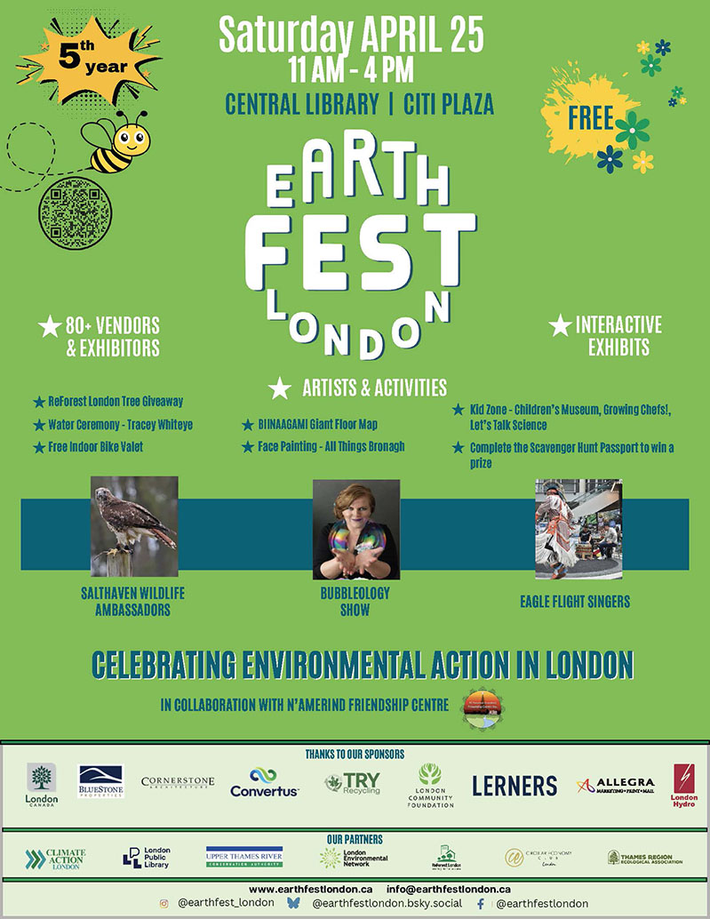 【加国生活网】安省的伦敦市将在本周六举行号称是加拿大最大的“地球日”活动Earthfest 2026,届时London市中心的City Plaza和中央图书馆这两个地点将从上午11点至下午4点会举行各种各样的活动,包括将有100多家参展商开设互动展示摊位,此外还有音乐、艺术、儿童游戏,活动涵盖了水、气候行动、自然、当地食品、自行车、再利用和维修等行业,免费参加。