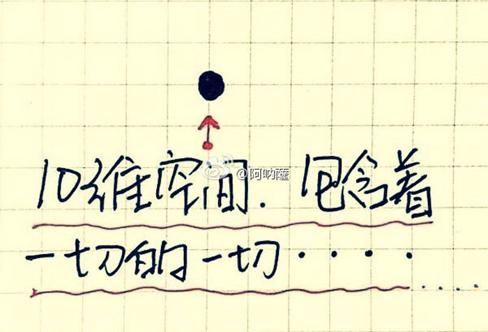 八维空间继续升级。还是那个“你”,以八维空间的点为起始,我们必须想出所有的可能,每一种可能都与八维的这个点相连,最后,我们得到十维空间里的一个点,充满着九维空间中所有可能性的连线。
