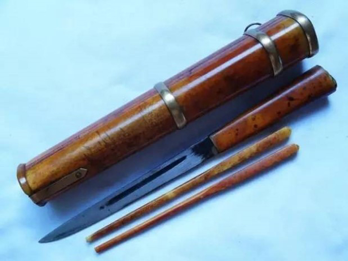 这就是“刀筷组合”。 餐刀和筷子套用,而且装在一起,方便携带。吃饭既显得贵族气质有格调,还具有实用切肉的功能。