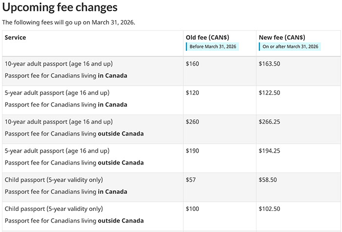 加拿大护照及相关费用从2026年3月31日起变更如下: