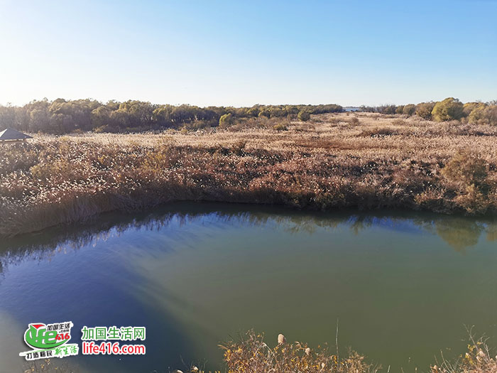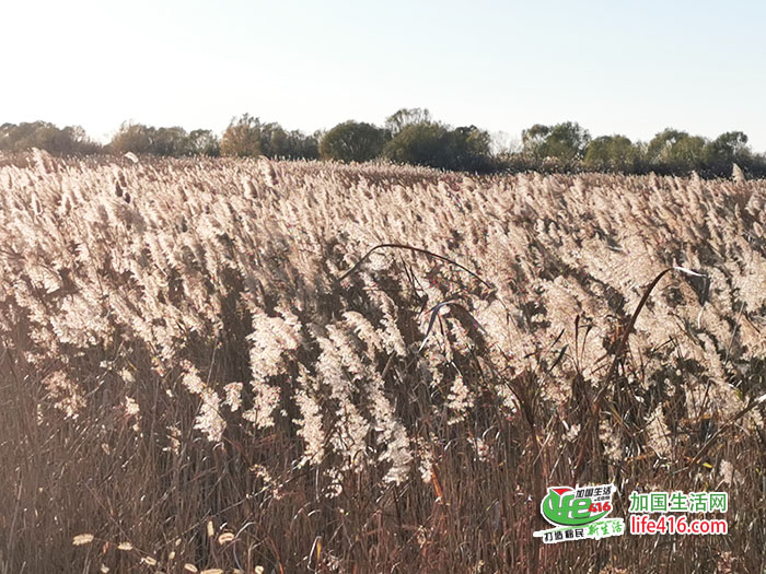 夕阳为连片芦苇镀上金边,随风漫卷的芦花与湿地相映成趣,熠熠生辉