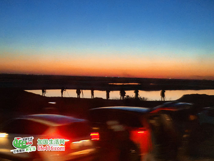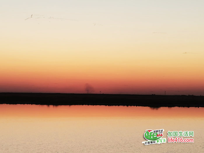 随着太阳渐渐下山,夕阳的颜色也在不断变化中,天边陆续飞来变幻着各种队形的鸟群,但这些都不是“鸟浪”